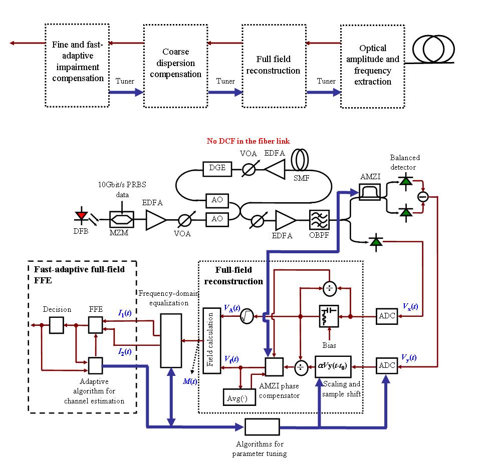 The technique uses an asymmetric Mach-Zehnder interferometer and inexpensive direct detectors to extract both the optical amplitude and instantaneous frequency information. This information is used to reconstruct the full-field representation of the distorted signal. In a first stage of EDC, the reconstructed distorted signal is processed, and coarse chromatic dispersion and static system impairments are compensated by a cost-effective dispersive transmission line with parameters updated at a selected rate. In a second stage, refined dispersion and system impairments are provided by an adaptive electronic equalization circuit with parameters updated at a faster rate than those in the dispersive transmission line. Each step in the process provides control feedback to the preceding steps, thereby significantly reducing sensitivity to system variabilities.