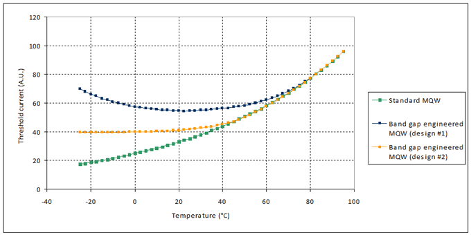 Customised band gap modifications dramatically alter the temperature characteristics of the MQW laser. As illustrated below, the engineered structure exhibits a significantly higher characteristic temperature and therefore a weaker temperature sensitivity. At lower temperatures the device exhibits a seemingly anomalous phenomenon where the threshold current increases at lowered temperatures. Via related mechanisms the slope efficiency is also stabilised.