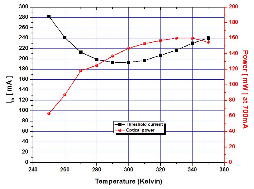 Conventional 14xx-nm Raman pumps require thermoelectric coolers to maintain stable operation at elevated ambient temperatures. Simulations indicate the band gap engineered designs can operate up to 350°K with minimal change to the threshold current and thereby optical power. As illustrated below, the threshold current remains with 10 percent of its ambient temperature (300°K) value from 270°K to 330°K, and within 20 percent from 260°K to 350°K.Elimination of the thermoelectric cooler reduces the pump module power consumption from c.7W to 1.7W for comparable output optical power (mW) at 75°C.
