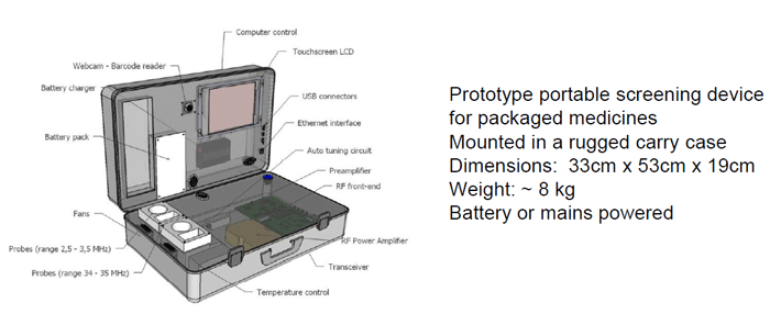 Counterfeit and substandard medicines constitute a serious threat to public health. The scale of the problem is already great – particularly in the developing world – and is still growing. Funded by the Wellcome Trust, King's College London researchers have developed a prototype portable medicines authentication device based on quadrupole resonance (QR) spectroscopy. Employing innovative parametric data processing techniques developed in association with Lund University, the system provides non-invasive non-desructive and quantitative inspection of packaged medicines. A prototype authenticator has been developed and is presented for commercialisation.